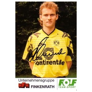 Original signierte Autogrammkarte von Bodo Schmidt im Trikot von Borussia Dortmund. Bodo Schmidt (* 3. September 1967) ist ein ehemaliger deutscher Fußballspieler. 1989 spielte Bodo Schmidt erstmals im Profifußball bei der SpVgg Unterhaching in der 2. Fußball-Bundesliga. Zwei Jahre später holte ihn Borussia Dortmund in die 1. Bundesliga. Als er 1996 die Borussen verließ, blickte er auf 116 Spiele zurück und hatte sich zum gestandenen Verteidiger entwickelt. Auch beim 1. FC Köln war er zwei Jahre lang tragende Kraft in der Verteidigung. 1998 wechselte er zum 1. FC Magdeburg, mit denen er in der Saison 2001/02 in der Regionalliga Nord spielte. Am Saisonende stand der Abstieg für Magdeburg und Schmidt wechselte zur Flensburg 08, wo er 2005 seine aktive Laufbahn beendete und als Cheftrainer seine Arbeit in Flensburg fortsetzte. Er war bis zum Ende der Saison 2006/07 Trainer von Flensburg 08 und jetzt ist er Trainer vom SV Frisia 03.